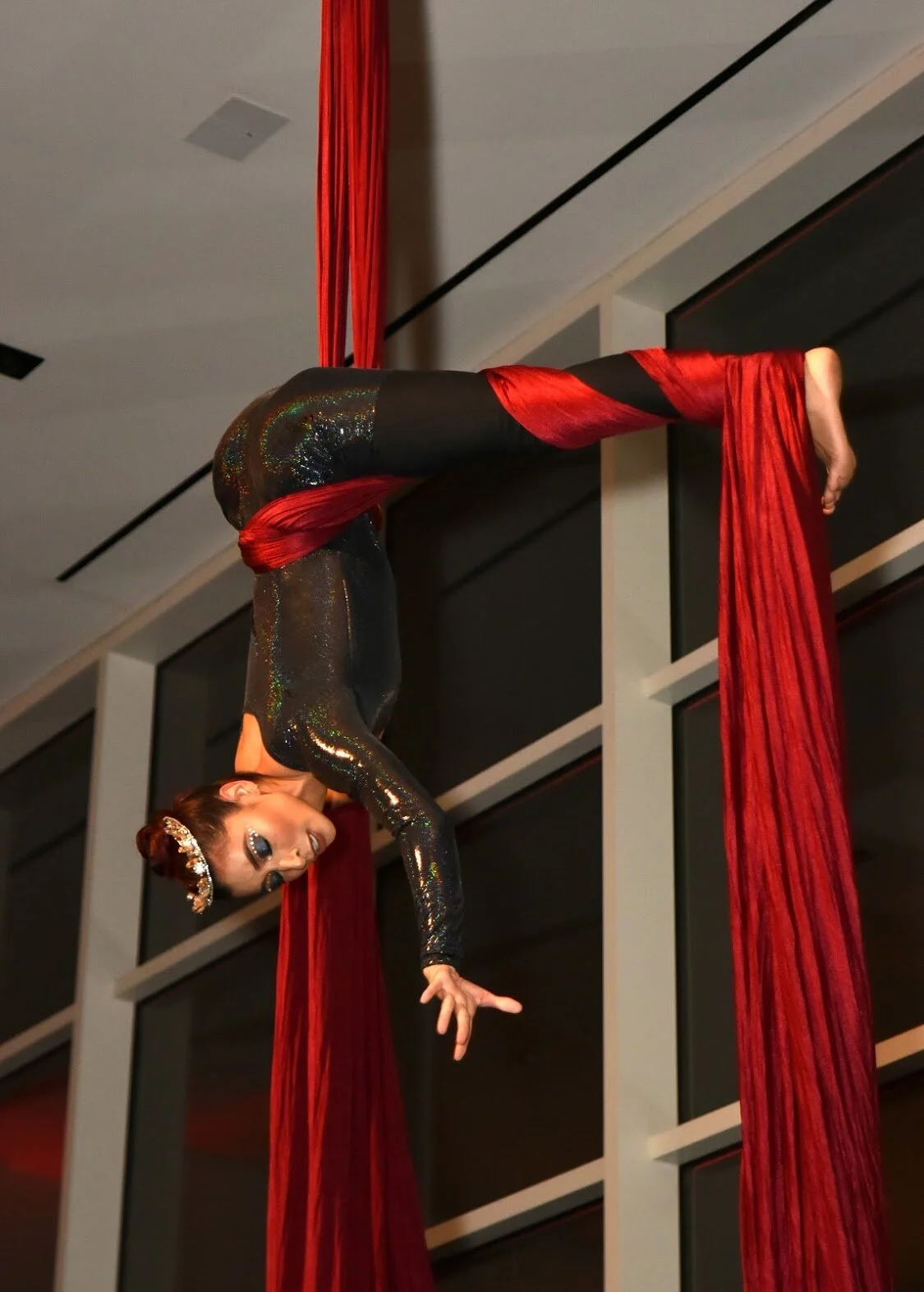 Aerial silks act inspired by the Brothers Gimmm story ‘The Twelve Dancing Princesses.’ This act encapsulates the aftermath of the Princesses’ deception and the curse they are left to deal with. This dynamic yet heartfelt act invites the audience to come up with their own interpretation of the story.